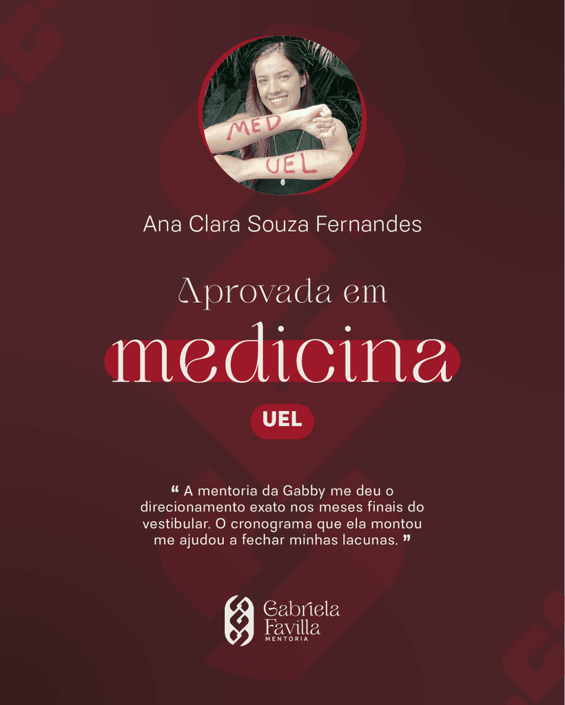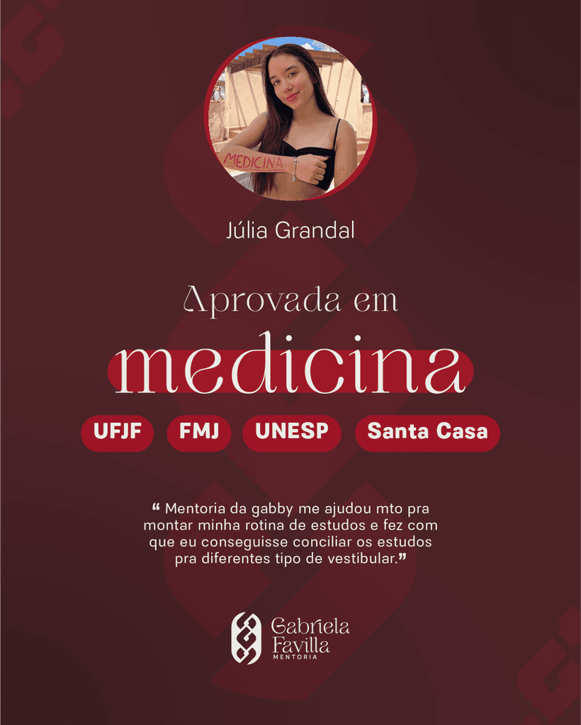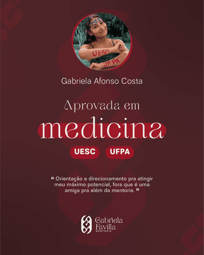 Criadora da Mentoria Gabriela Favilla, o programa de mentoria perfeito para quem ser aprovada(o) em Medicina, foi responsável por estruturar uma metodologia exclusiva que concilia o acompanhamento particular do aluno com as ferramentas ideais para quem busca o alto desempenho no vestibular.