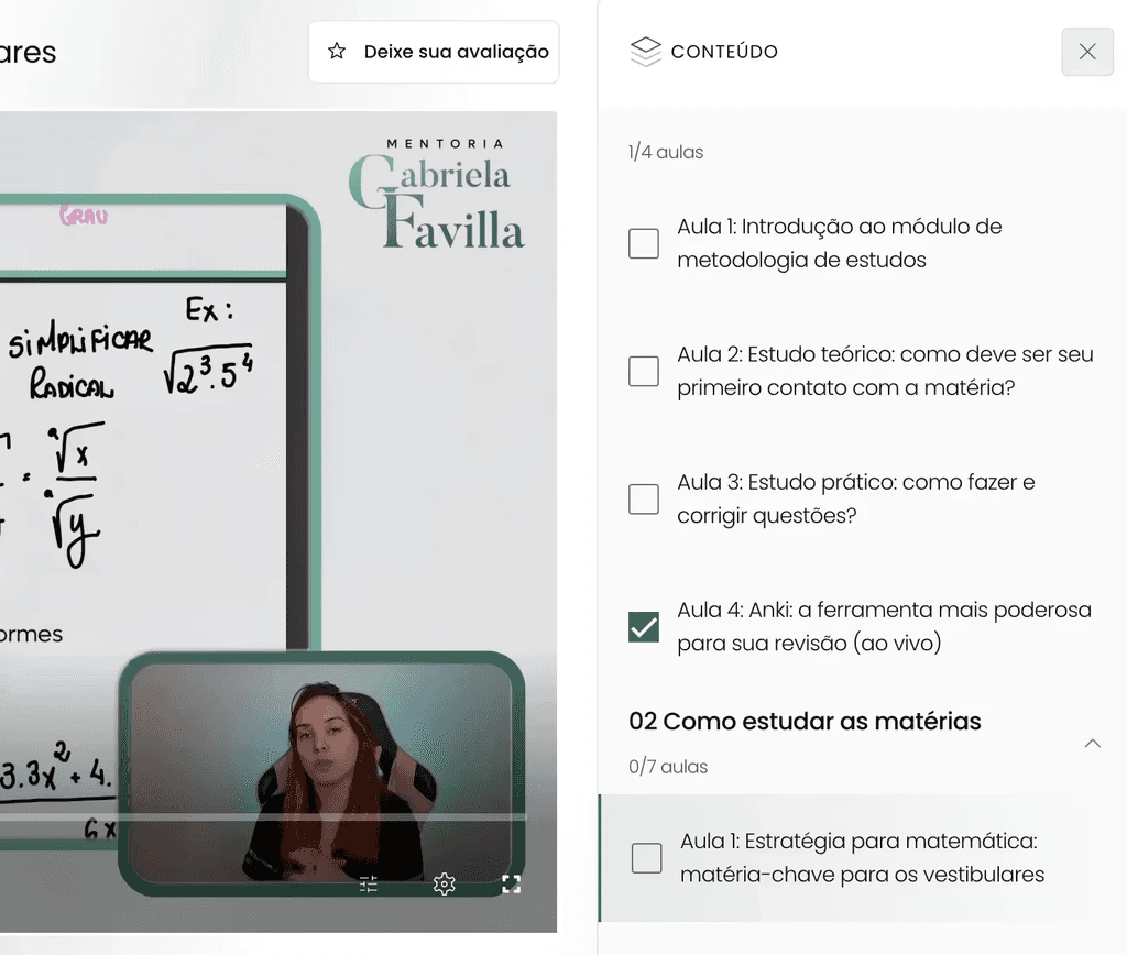 Você marca sua mentoria individual comigo - Gabriela Favilla - e elaboraremos seu cronograma de estudos na nossa videochamada exclusiva para te passar toda a estratégia de acordo com sua individualidade.