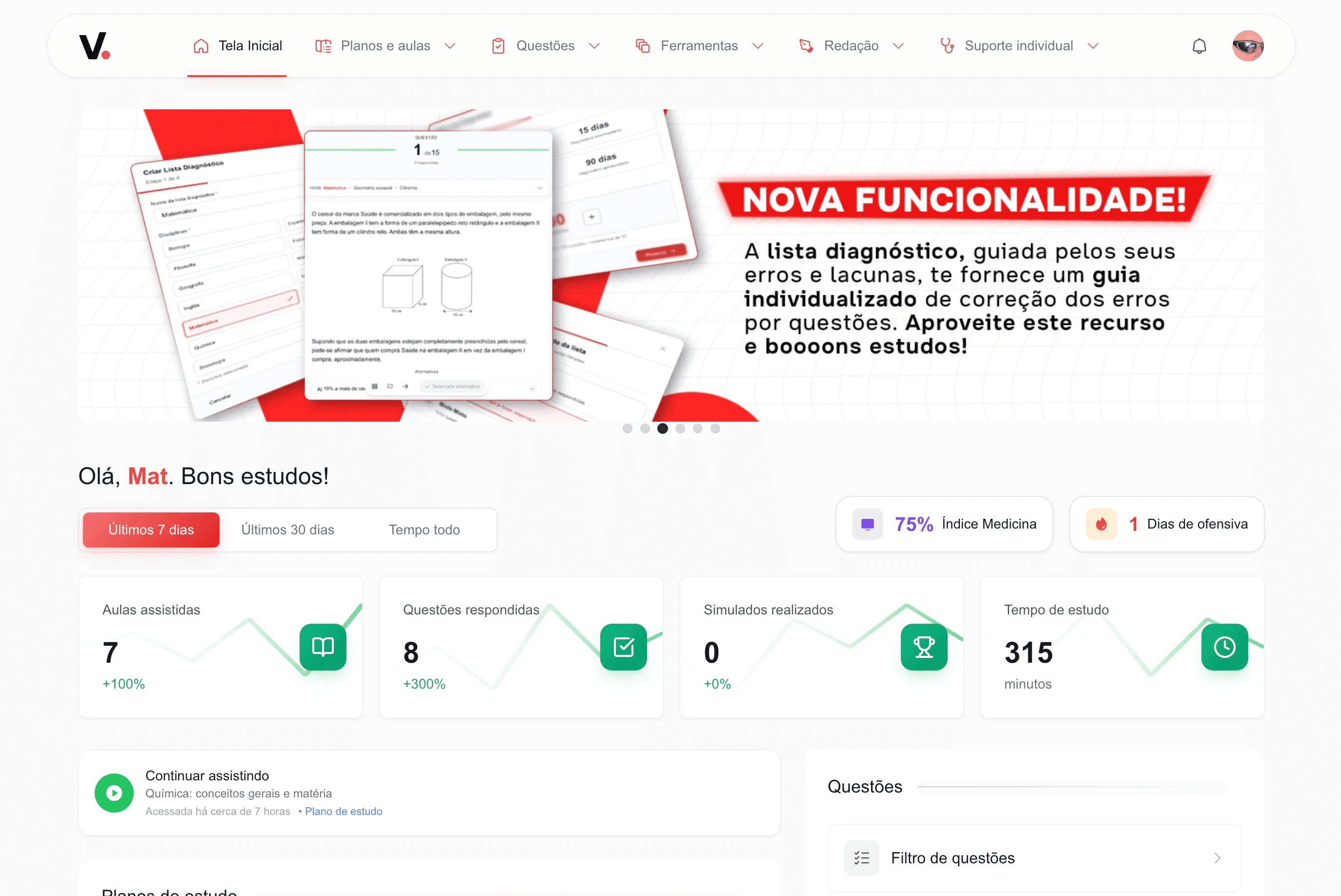 Aulas teóricas, listas de questões e métricas com acesso completo à Nova Plataforma Vinícius Oliveira